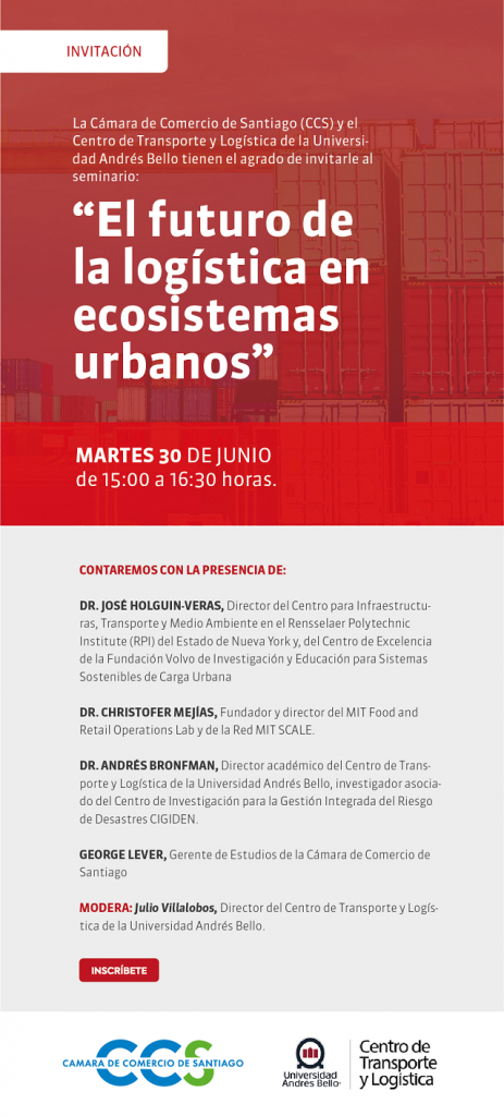 La Cámara de Comercio de Santiago (CCS) y el Centro de Transporte y Logística de la Universidad Andrés Bello tienen el agrado de invitarte al seminario online “El futuro de la logística en ecosistemas urbanos”, este martes 30 de junio, de 15 a 16:30 horas. Inscríbete aquí